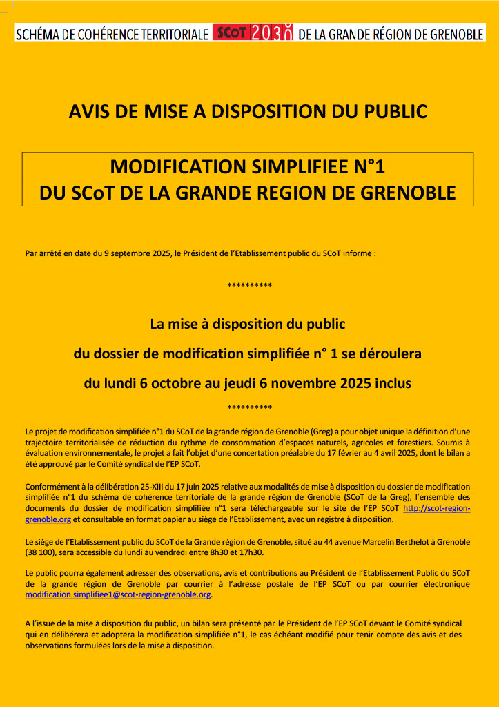Avis de mise à disposition du public dans le cadre de la procédure de modification simplifiée n°1 du SCoT de la grande région de Grenoble.